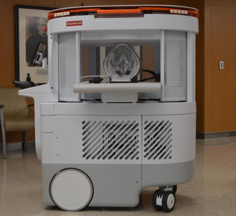 Inside the patient room, the portable MRI is positioned at the head of the bed, and the patient’s head is gently placed into the imaging receiver.