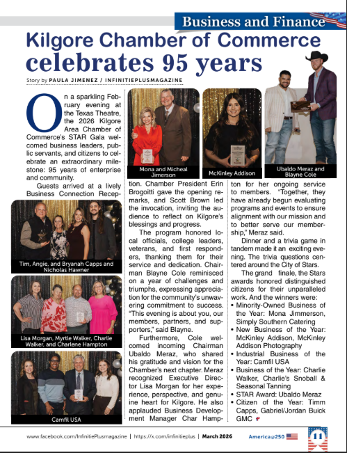 On a sparkling February evening at the Texas Theatre, the 2026 Kilgore Area Chamber of Commerce’s STAR Gala welcomed business leaders, public servants, and citizens to celebrate an extraordinary milestone: 95 years of enterprise and community.