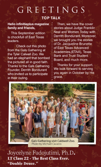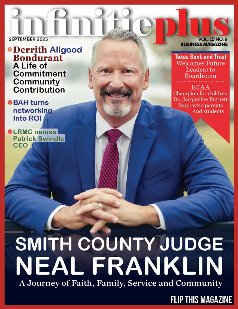 Enjoy infinitieplus magazine’s September 2025 publication featuring the Smith County Honorable Judge, Neal Franklin, as the Cover Story and a community icon, Derrith Bondurant, for Women Today.