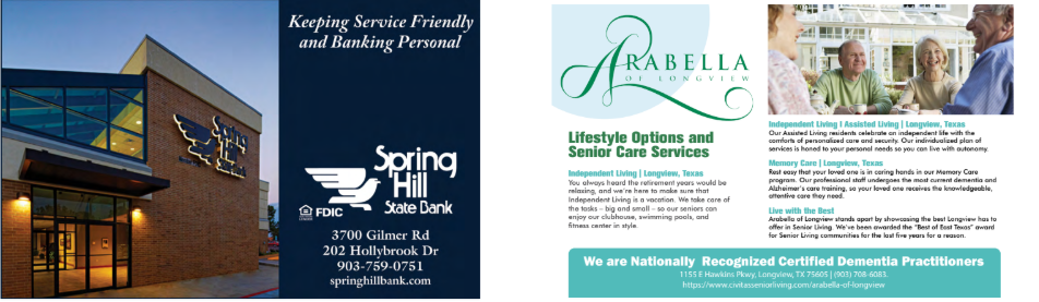 Thank you to the current advertisers: Longview Regional Medical Clinic, Trina Griffith & Company Real Estate LLC., Texas Bank & Trust, Springhill State Bank, Arabella of Longview Senior Living, Austin Bank, R&K Distributors, and Rumours Wellness Spalon.